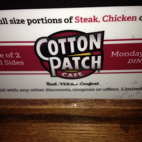 Cotton Patch Cafe Upcoming - Cotton Patch Cafe Cotton Patch Cafe Upcoming CHICKEN FRIED BIRTHDAY AUGUST 13TH We're 33 and THRIVING! Come on out to your local Cotton Patch Cafe and get a $7 Chicken Fried Steak or Chicken Fried Chicken with Souther Green Beans & Garlic Mashed Potatoes. GIVEAWAY! Tickets to Dallas' Favorite Football Team Cotton Patch Cafe Coupon Code: Half off your burger on 9/18/22 4pm to close Cotton Patch Cafe Coupon Codes, Printable coupons, and Promo Codes 9 Coupon Codes Available 4 Online Coupons 3 Coupon Codes added this week New Coupon. Cotton Patch Cafe. Half off your burger on 9/18/22 4pm to close - with Coupon Code: BURGER50 $20 OFF Cotton Patch Cafe Coupons & Promo Deals - Denton, TX Trying to find some great printable restaurant coupon codes and deals for Cotton Patch Cafe for free? Cotton Patch Cafe is a Southern restaurant. It's located at 2505 W University Dr in Denton, TX 76201. About Cotton Patch Cafe in Denton There are bunch of places near Cotton Patch Cafe giving great discounts. This discounts range from $ to $. Cotton Patch Cafe - Order Online Order Ahead and Skip the Line at Cotton Patch Cafe. Place Orders Online or on your Mobile Phone.